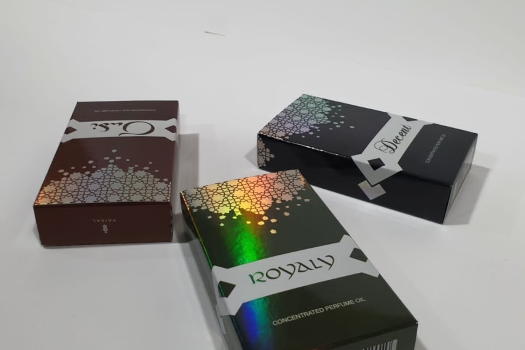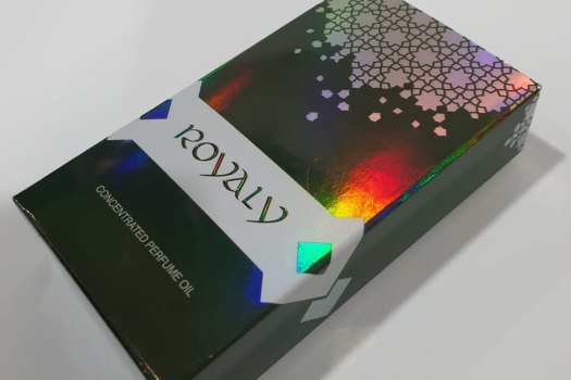 Product: Faisal Roll-on Box Material: 350 GSM FBB Printing: UV metallic multi color Surface Finish: Gloss + UV embossing Why this: Premium attar packaging box printing with rainbow finish. Custom printed attar box 6 ml roll on with tray.