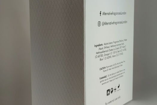 Product: VNS Perfume Box Material: 350 GSM FBB Printing: UV metallic multi color Surface Finish: Gloss coating Why this: Premium perfume packaging box printing with gloss finish. Custom printed perfume box blue metallic design.